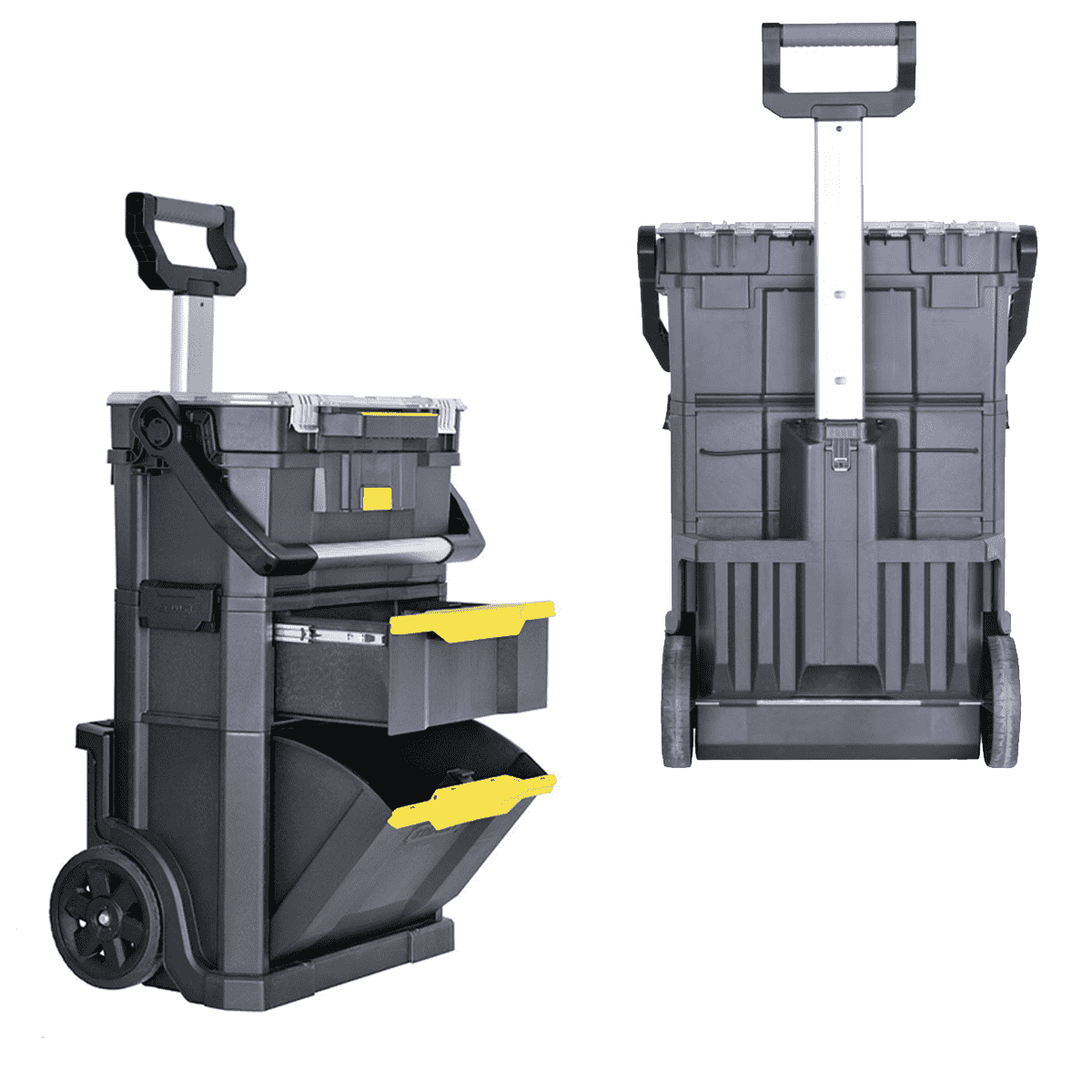 עמדת עבודה נוחה, מאורגנת ומסודרת, עם 3 קומות. רוחב: 38 ס"מ אורך: 57 ס"מ גובה: 77 ס"מ. העמדה בנויה מ-3 קומות. כולל ארגז "19 סגר אוטומטי עם ידית מתכת + אורגנייזר מתחבר. יחידת אחסון נפרדת. מכולה גדולה על גלגלים מאסיביים + ידית טרולי.